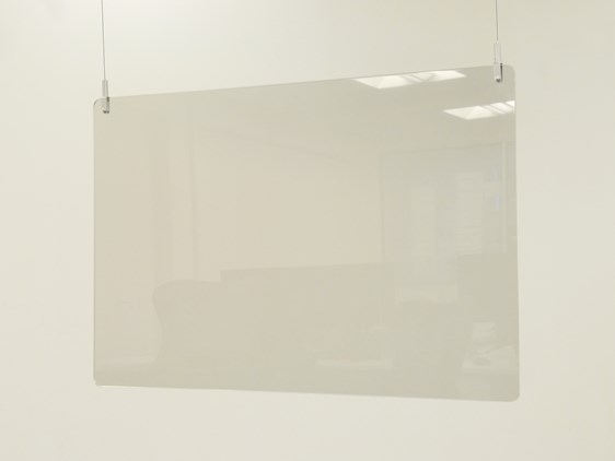 The light-weight transparent hanging sneeze screen made from crystal clear acrylic sheet suspended by an attractive adjustable, attractive wire hanging system. Available with options in ceiling mounts to suit both solid and suspended ceilings.
